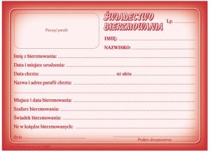 - Szczegóły dotyczące bierzmowania: miejsce, data, szafarz oraz świadek.