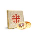 Zestaw bursa AS438 z cyborium do chorych to komplet liturgiczny w wymiarach 18 × 18 cm, mieszczący do 16 dużych komunikantów (śr. 38 mm). Bursa z brokatowej tkaniny złotej z czerwonym haftem krzyża jerozolimskiego z pracowni ASGA Kierlikówka, cyborium z mosiądzu złoconego o średnicy 8 cm i głębokości 1 cm właskiej firmy Calandrini.