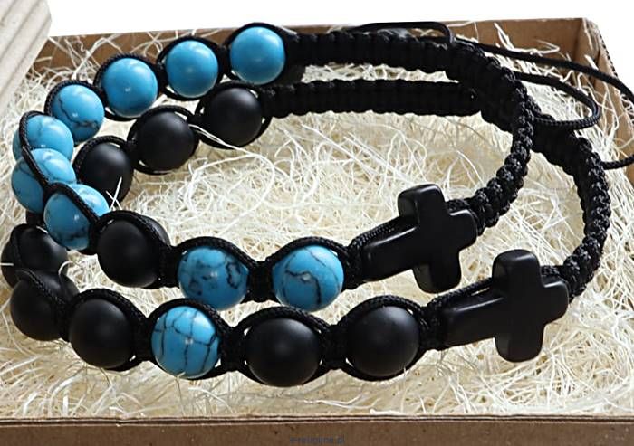 Różańce idealnie się uzupełniają, wykonane są z kamieni matowego onyksu oraz turkusu. Kamienie mają wielkość 8mm.