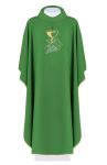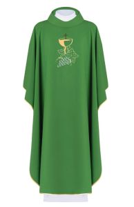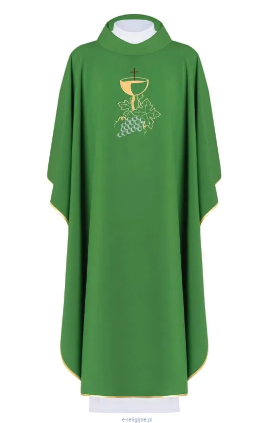 Ornat wykonany z wysokiej jakości lekkiej tkaniny gładkiej, przewiewny, zdobiony haftem z motywem kielicha, krzyża i winogron.